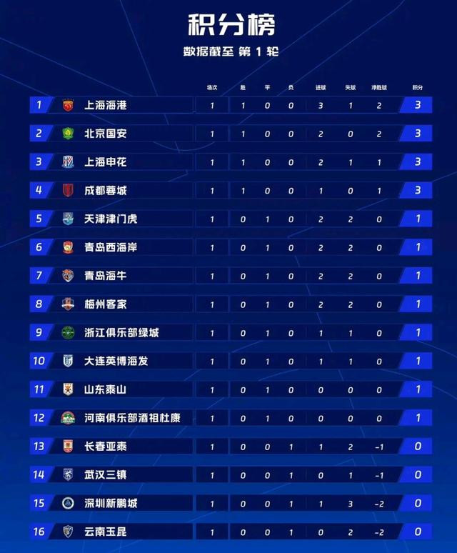 首轮结束之后,卫冕冠军上海海港主场火力全开,凭借闪电战击退了来访的深圳新鹏城,强势领跑积分榜,而国安、申花、蓉城也在首轮获胜后在积分榜紧随其后。